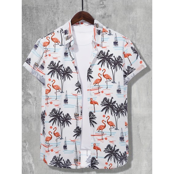 Men's Shirt Top, Flamingo & Coconut Tree Print, Camp Collar Bowling Shirts Short Sleeve Closure Summer Hawaiian Shirt Male Casual Button Up Shirt For Daily Vacation Resorts Beach Shirts For Men
